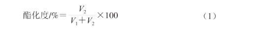 称取100 mg不同脱酯果胶溶解于30 mL去离子水中,搅拌过夜。滴定前向果胶溶液中滴加3滴酚酞作为指示剂,用0.1 mol/L氢氧化钠滴定液将果胶溶液滴定至颜色变为粉红色,记录消耗的滴定液体积V1。向体系中加入10 mL 0.1 mol/L氢氧化钠溶液,脱酯15 min后,再加入10 mL 0.1 mol/L盐酸溶液。然后用0.1 mol/L氢氧化钠滴定液滴定体系中过量的盐酸,直至颜色变为粉红色,记录滴定液消耗量(V2)。按式(1)计算果胶酯化度:
