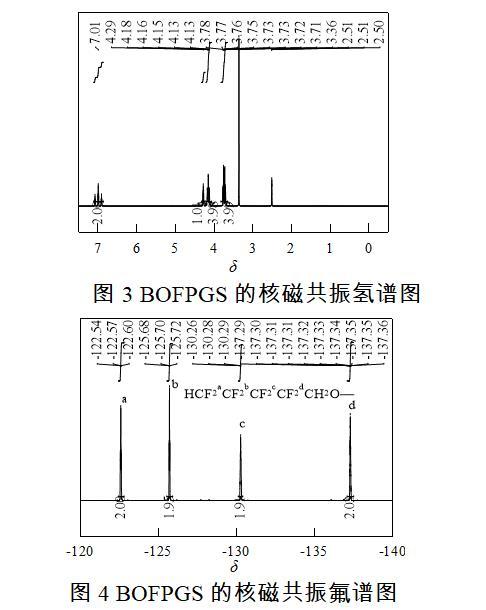 通过核磁共振氢谱图对BOFPGS的结构进行分析,结果如图3所示。BOFPGS的核磁共振氢谱表征数据如下:1HNMR(600 MHz,DMSO-d6),δ:7.0(tt,J=50.3、5.6 Hz,2H,HCF2—),4.28〔p,J=4.9 Hz,1H,—OCH2(CHCH2—)O—〕,4.21~4.09〔m,4H,—OCH2(CHCH2—)O—〕,3.74(ddd,J=26.0,10.7,4.9 Hz,4H,—CF2CH2—)。图4为BOFPGS的核磁共振氟谱表征,数据如下:19FNMR(400 MHz,DMSO-d6),δ:-122.57(t,J=10.7 Hz,Fa),-125.70(t,J=8.4 Hz,Fb),-130.06~-130.55(m,Fc),-137.19~-137.64(m,Fd)。