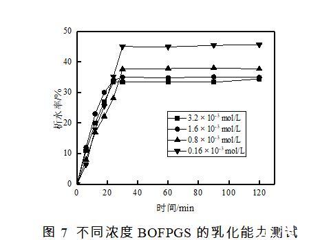 将同等体积的BOFPGS水溶液与液体石蜡混合均匀之后,在50℃恒温中静置观察所形成的乳液析水情况,析水率越小说明乳化能力越强,形成的乳液越稳定。BOFPGS与液体石蜡形成乳液的析水率如图7所示。从图7可以看出,乳液随着静置时间增加,析水率增大,约在30 min以后乳液达到稳定,析水率趋于平衡。BOFPGS浓度越大乳液越稳定,析水率越低,BOFPGS浓度为0.8×10-3、1.6×10-3和3.2×10-3 mol/L的乳化性能接近,相较于KANG等人合成的短氟链阴离子表面活性剂(在表面活性剂质量分数为1%的水溶液中才能表现出稳定的乳化性能),BOFPGS的用量更低,具有更好的乳化性能,可大大降低BOFPGS的使用成本。