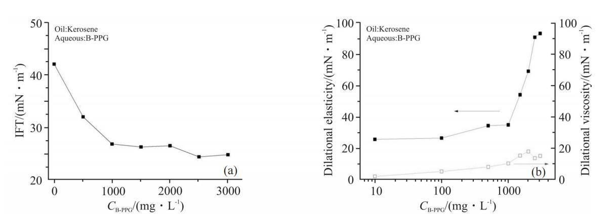 B-PPG是部分支化、部分交联的聚丙烯酰胺,其分子结构中既含有亲水基团丙烯酰胺,又含有疏水的烷基链,是一种高分子量的界面活性物质,能够在油水界面上自发地吸附成膜,降低界面张力。Fig.2为B-PPG浓度对煤油-水界面张力和界面扩张流变参数的影响。由Fig.2(a)可知,B-PPG溶液具有一定的界面活性,随着其浓度增大,界面张力逐渐降低,浓度高于1000mg/L后,达到平台值,约为25为mN/m。由Fig.2(b)可以看出,浓度低于1000mg/L时,B-PPG形成的界面膜强度较低,扩张弹性和扩张黏性随浓度缓慢增大。扩张弹性从约25mN/m升高到35mN/m,扩张黏性从约1mN/m升高到10mN/m;当B-PPG浓度大于1000mg/L时,随着浓度的增大,界面膜的扩张弹性显著升高,浓度达到2000mg/L时,扩张弹性高达90mN/m;而扩张黏性变化不大,仅上升到约20mN/m。