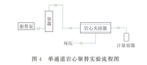 将3块岩心抽真空后,饱和原油,根据饱和油的体积计算岩心孔隙度;将饱和好油的岩心在地层温度下恒温放置48h;使用标准盐水进行水驱油,采出液含水率达到98%以上时停止,然后在地层温度(30℃)下分别使用配制的CAO、CCAO和FHQ-I继续以0.5PV的体积驱油,接着水驱直至含水率达到98%,计算出油体积,记录驱替过程中压力变化及采出液中的含油量,计算各阶段采收率,结果见表6,驱替实验流程如图4所示。