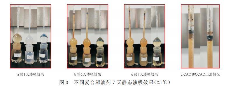 将岩心在110℃下烘干,称重;将饱和好油的岩心置于阿莫特密封瓶(Amott cell瓶)中,分别加入试样溶液(CAO、CCAO或FHQ-I的标准溶液)至略超过Amott cell瓶的最低刻度处,在25℃环境中,观察并记录其出油体积,通过计算得到的结果见表5,同时观察不同时间饱和岩心渗吸出的原油形态(如图3所示)。