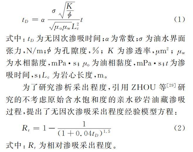 为研究黏度及界面张力对渗析采出程度的影响,引用MA等推导出的公式(1),式中同时考虑了亲水系统和渗吸亲油系统的无因次渗吸时间。