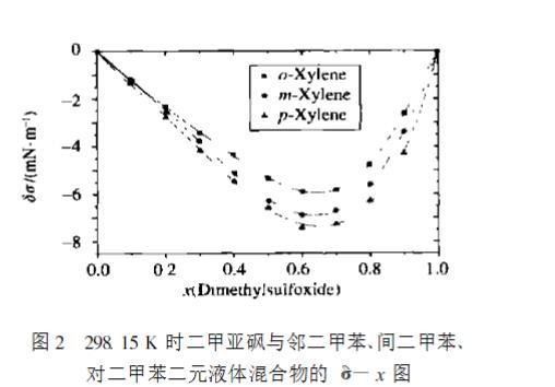 [图2 298.15 K 时二甲亚砜与邻二甲苯、间二甲苯、对二甲苯二元液体混合物的 δσ-x 图]